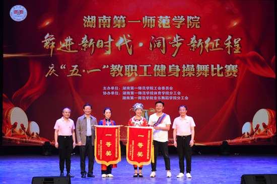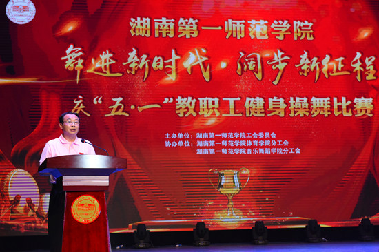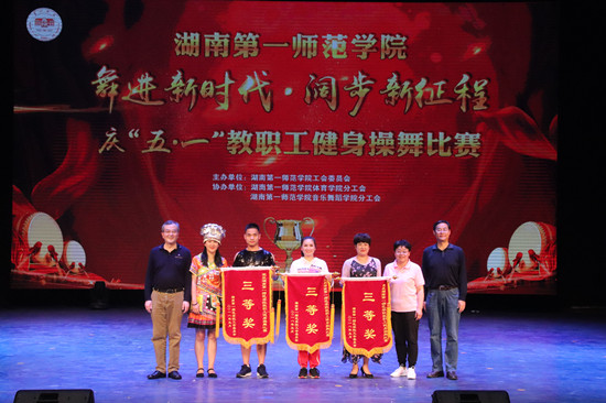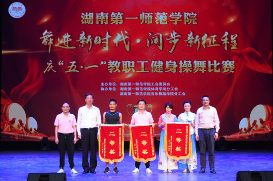 为庆祝五一劳动节,营造我校大众健身氛围,提升教职工身体健康素质,5月3日晚上,我校“舞进新时代·阔步新征程”庆五·一健身操舞比赛于东方红校区田汉剧场隆重举行,全校各分工会组织的18支参赛队伍参加了比赛。湖南省教育工会主席高新明莅临现场指导,我校在家校领导出席并参加了比赛。本次比赛的评委来自湖南省教育工会、湖南大学、湖南师范大学、湖南商学院、中南大学湘雅二医院等单位,比赛由我校工会主办,体育学院分工会、音乐舞蹈学院分工会协办。
