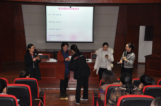 为丰富女教职工的业余生活,提升服饰搭配技巧,12月12日下午,校工会特邀全国五一巾帼标兵、湖南卫视特邀形象设计师、长沙市总工会女校校长、杨柳形象艺术学校校长杨柳来校作题为“服饰搭配的四重境界”的专题讲座。讲座由校工会常务副主席陆军主持。全校近百名女教职工参加讲座,在学习、感受服饰美、形象美的过程中,共同度过了一段美好而难忘的时光。