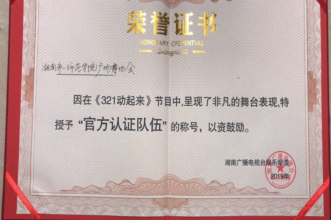 2019年5月,我校教职工广场舞协会受湖南娱乐频道邀请荣耀返场,会员们自编自导,表演了一曲深情的集体舞《我和我的祖国 》,借此机会向新中国成立70周年、改革开放40周年献礼!会员们在《我和我的祖国 》的欢快旋律中,尽情释放,跳出快乐,跳出健康;同时也彰显了我校教职工的良好素质。湖南娱乐频道向我校教职工广场舞协会举行了颁奖仪式,授予我校教职工广场舞协会“官方认证队伍”称号。