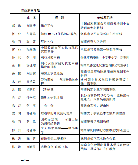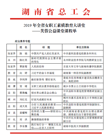 近日,湖南省总工会下发了“2019年全省女职工素质教育大讲堂——芙蓉公益课堂课程单”,我校万湘桂、向婷、吕紫薇三位老师的公益课程成功入选。