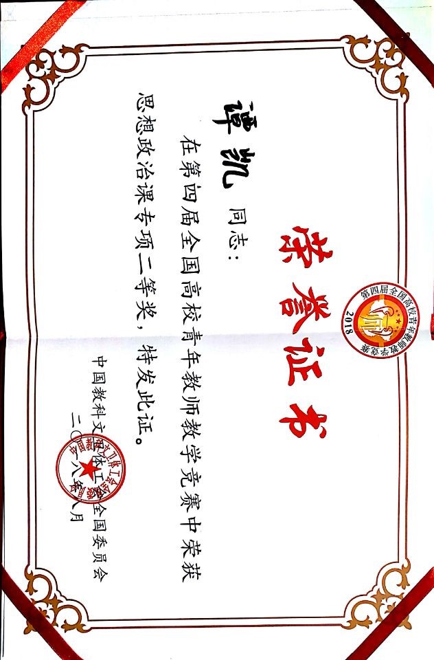 “奋进新时代,青年勇担当”。8月28日--31日,在为期4天的第四届全国高校青年教师教学竞赛决赛中,我校马克思主义学院谭凯老师获思想政治专项组二等奖。