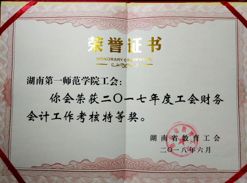 近日,湖南省教育工会下发《关于2017年度直属基层工会财务工作考核评比情况的通报》,我校工会财务工作继2016年获奖后,再次荣获省教育工会财务会计工作考核特等奖。