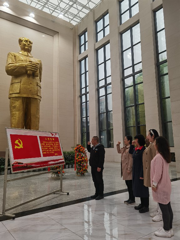 下午,全体党员怀着无比崇敬的心情走进了东山学校参观学习。大家参观了当年毛泽东求学时的教室、宿舍等旧址,全面了解了这所学校废科举、兴新学,开湖南新式教育之新河的办学理念,以及毛泽东、陈赓、谭政等老一辈革命家在此求学、探讨革命真理的故事。东山学校是毛泽东同志的母校。一百多年来,学校秉持“公诚勤俭”之校训,陶铸群英,培养了开国领袖毛泽东、开国大将陈赓、谭政、著名国际诗人萧三等一大批英才俊杰。大家在此追忆革命历史,缅怀革命先烈,接受红色洗礼,践行初心使命,全体党员在东山书院毛泽东的铜像前,面对党旗,重温了入党誓词。