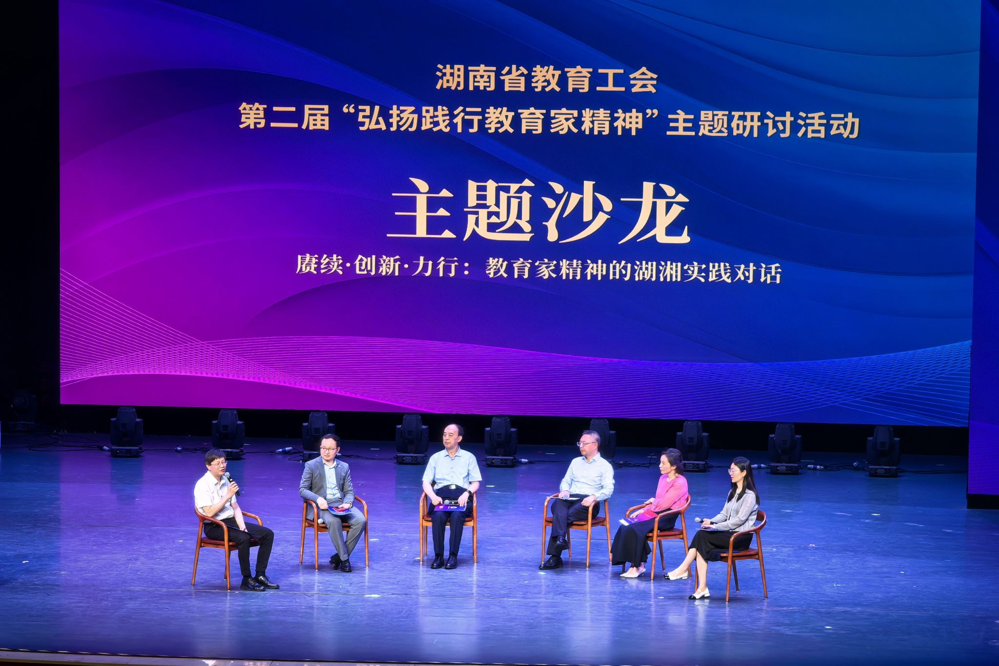 在“湖湘实践对话”主题沙龙中,专家学者与一线教师展开深度探讨。从教育高质量发展讲到教育制度创新,从徐特立“三个第一”等教育传统讲到人工智能赋能等现实课题,从思政教育创新实践讲到教师职业倦怠难题……思想的碰撞,勾勒出教育家精神从理念到行动、从历史到未来的完整图景,湖湘教育家的精神火炬正穿越时空,照亮育人征程。