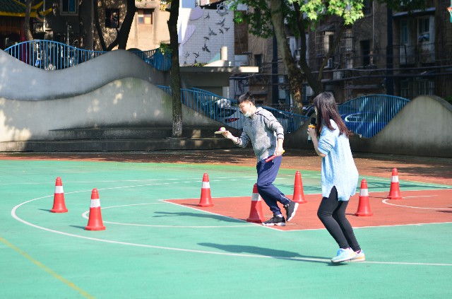 本次比赛形式有趣,内容丰富,参加比赛的教师从跳短绳、单双脚跳圈、接力跑、踢毽子、障碍跑运乒乓球、定点投篮六个项目中选择一项来完成,每6个老师为一组,以接力的形式进行。