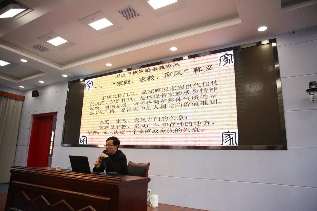 讲座中,为了让大家更好的明白什么是家庭、家教、家风,周部长从专业角度着手,解释了“家”、“庭”、“教”、“风”四字的含义,让我们明白了三者之间的关系:家庭是家教、家风产生和存续的地方,家教、家风决定一个家庭或家族的兴衰。