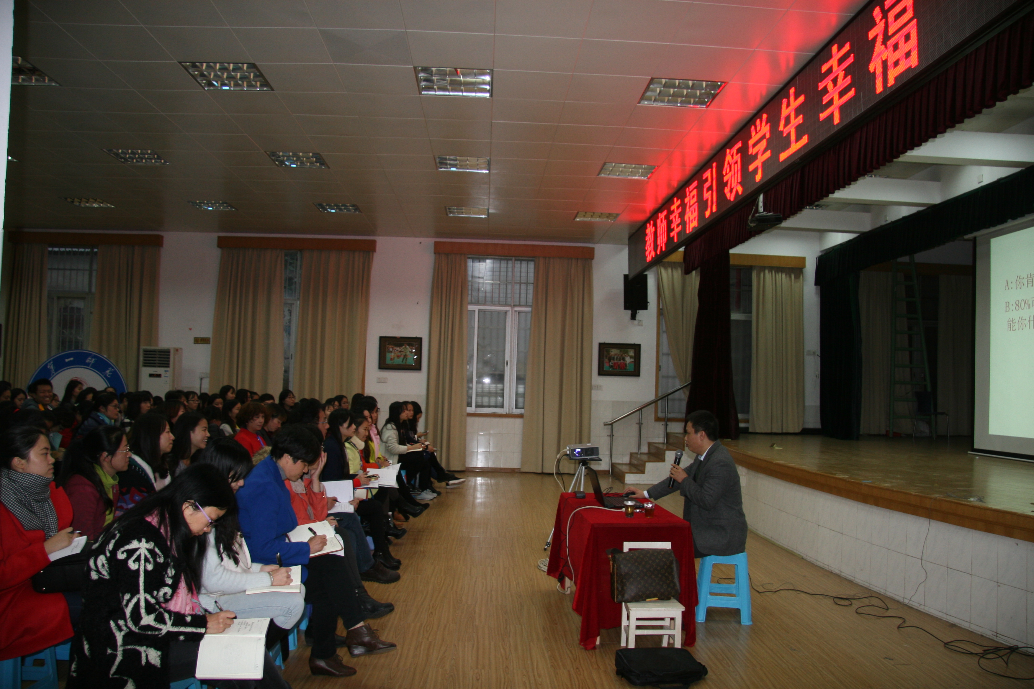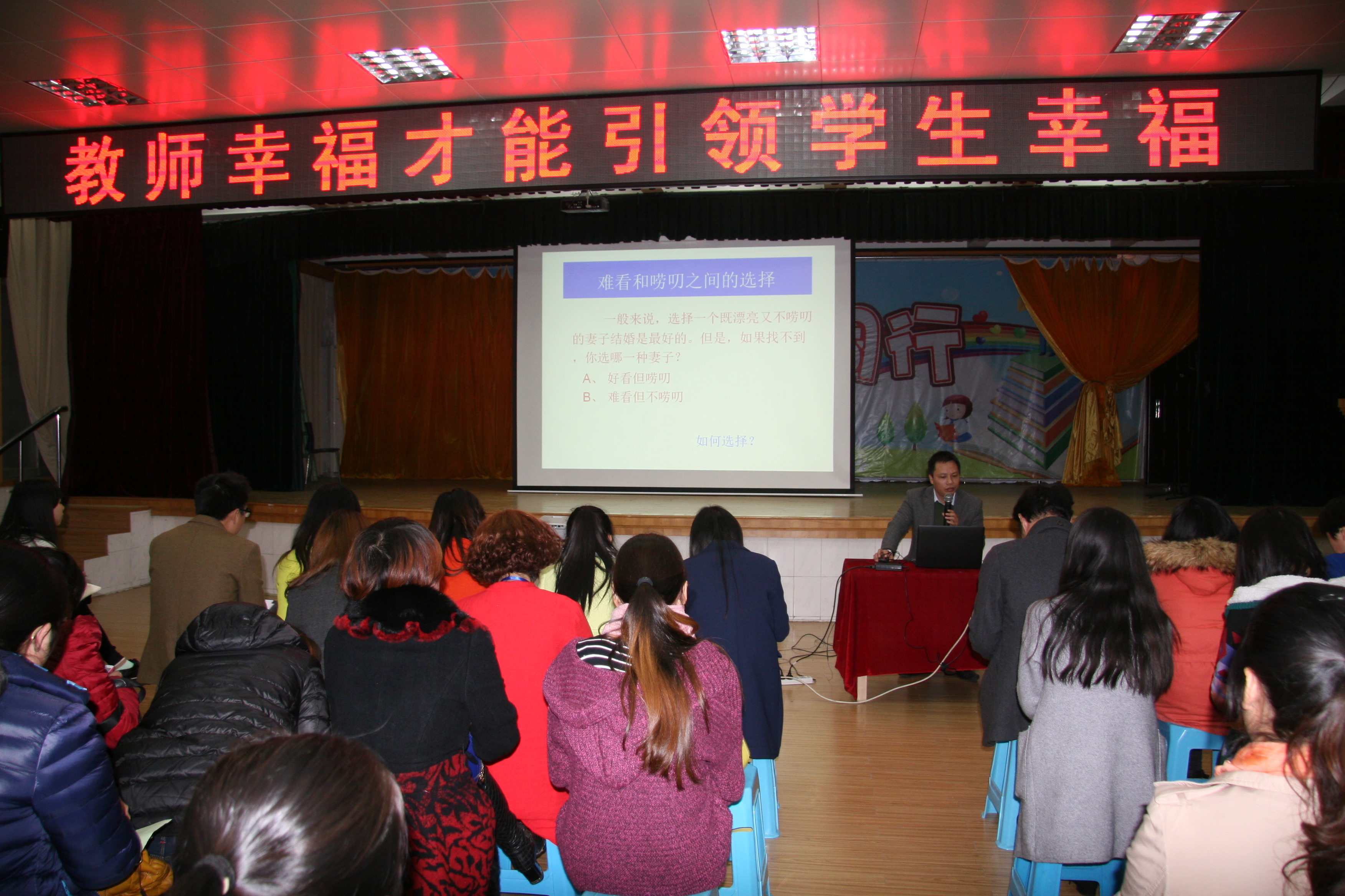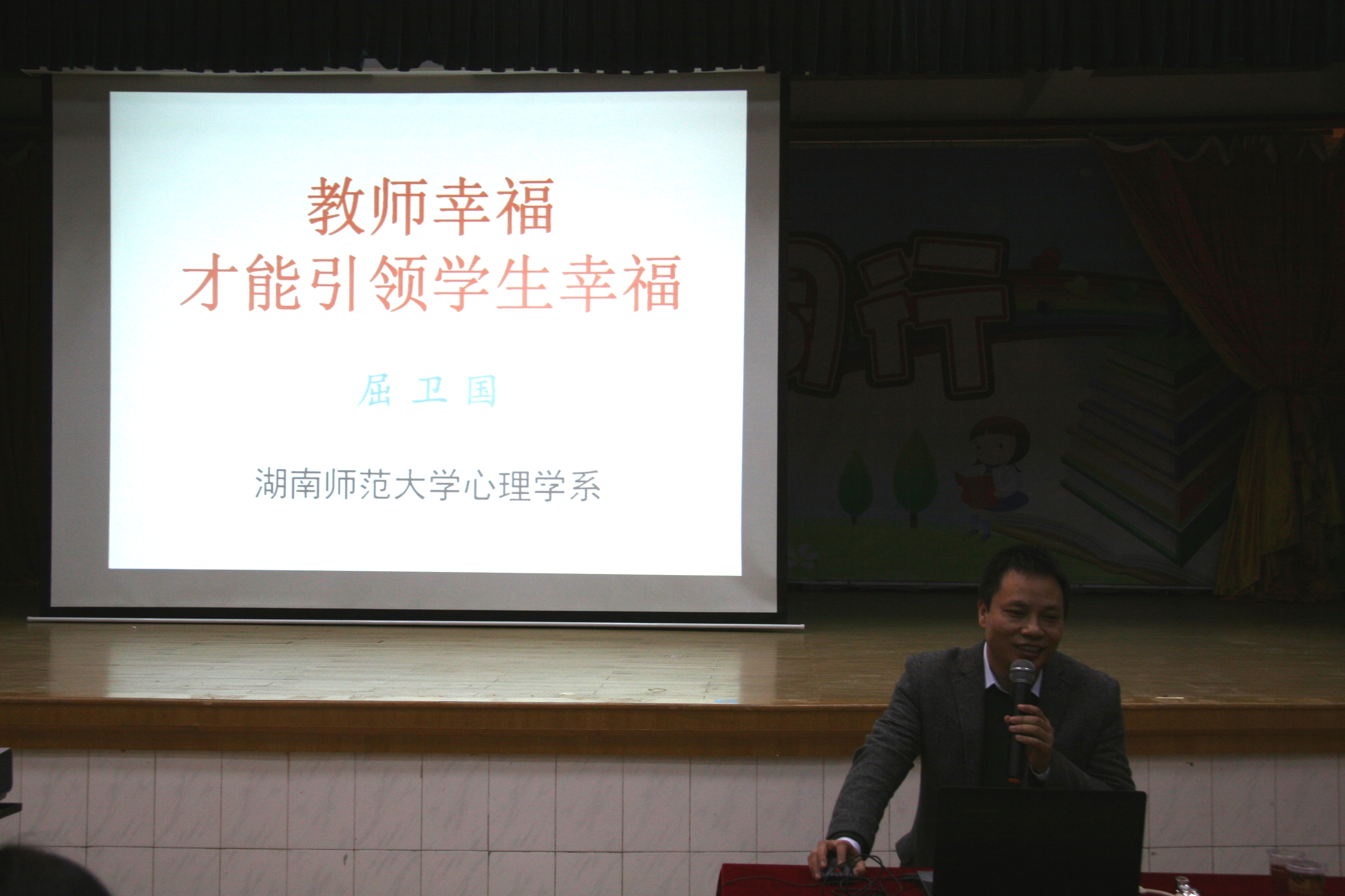 冬雨连绵,丝丝寒意。可是此时的一师二附小礼堂里却觉得格外的温暖和惬意。为了强化教师心理健康技能,让每一个学生能在一种幸福的环境中学习、成长,我校特邀请了湖南师范大学心理学屈卫国教授来给老师们进行了一堂以“教师幸福才能引领学生幸福”为主题的心理健康专题讲座。