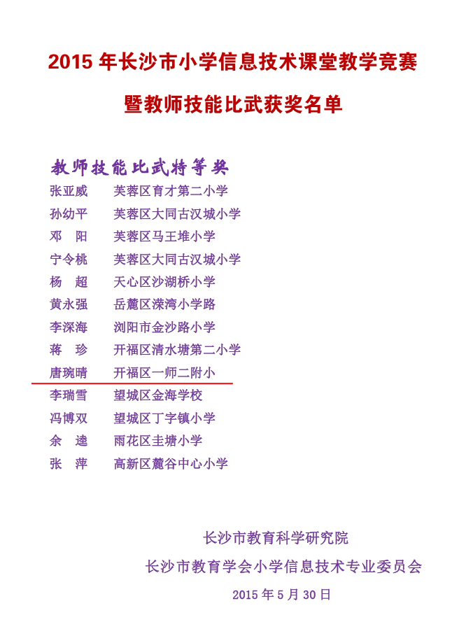 我校二附小唐琬晴老师荣获长沙市小学信息技术教师技能比武特等奖