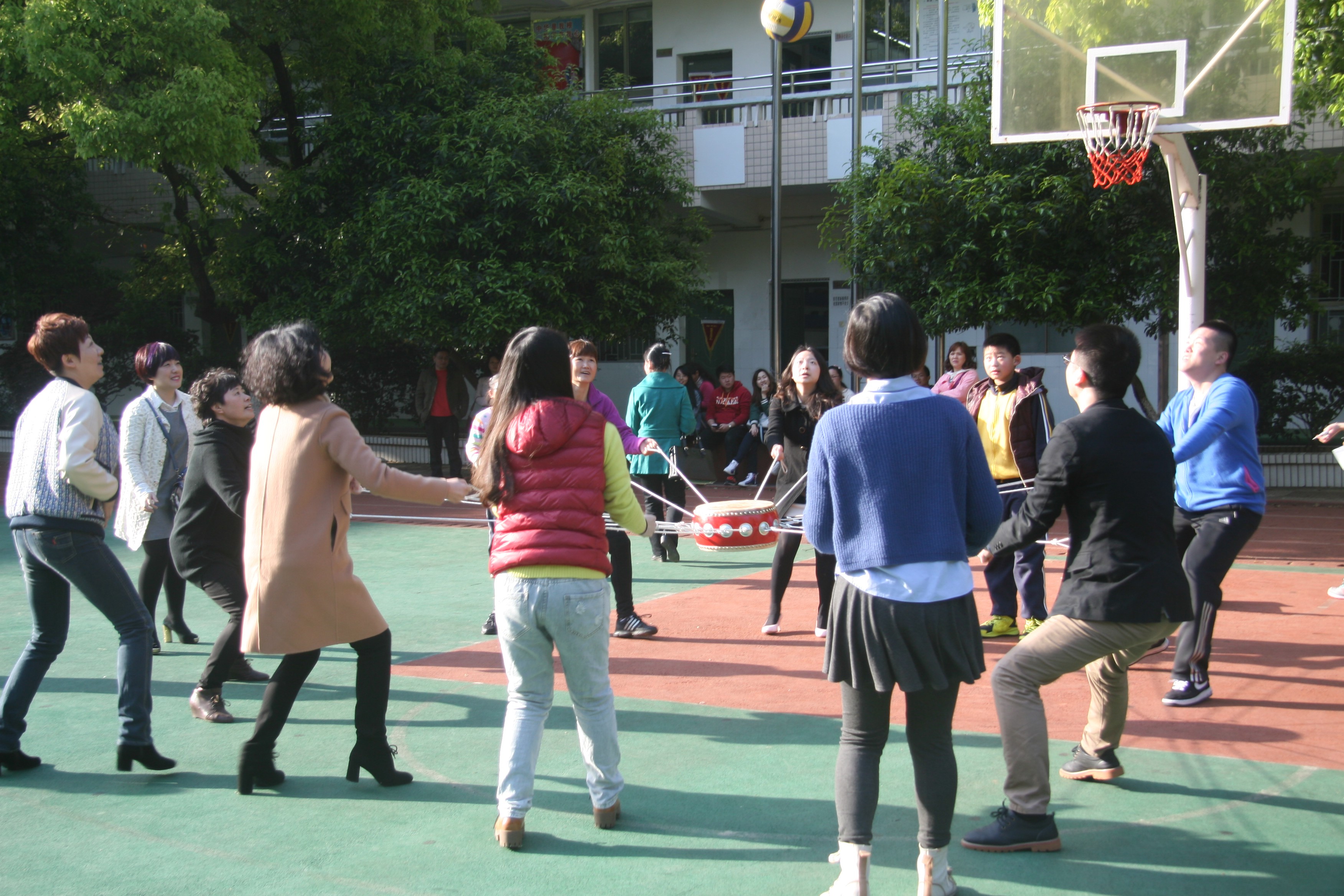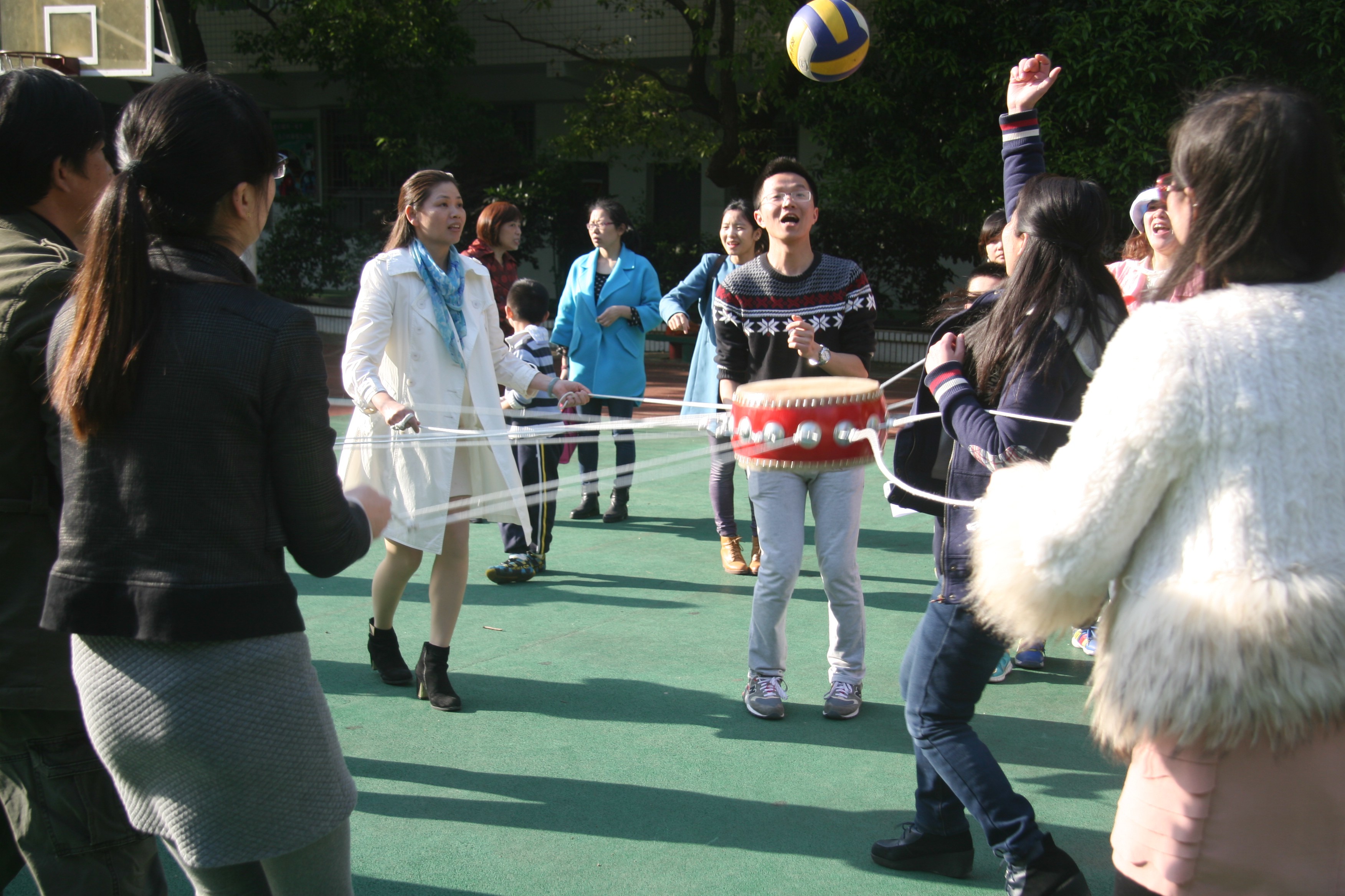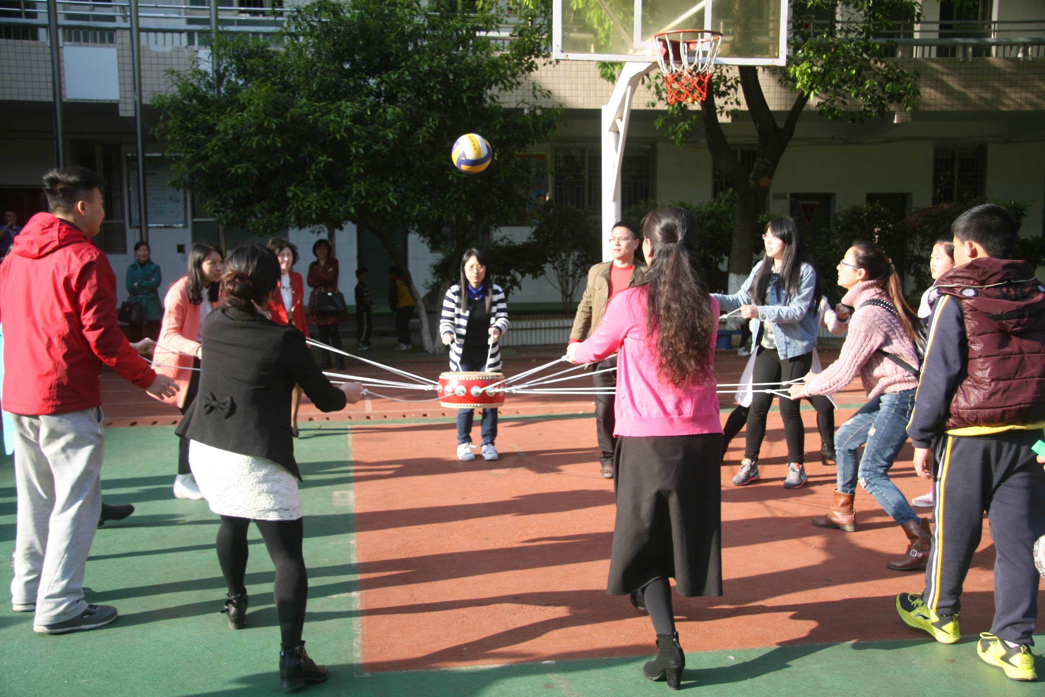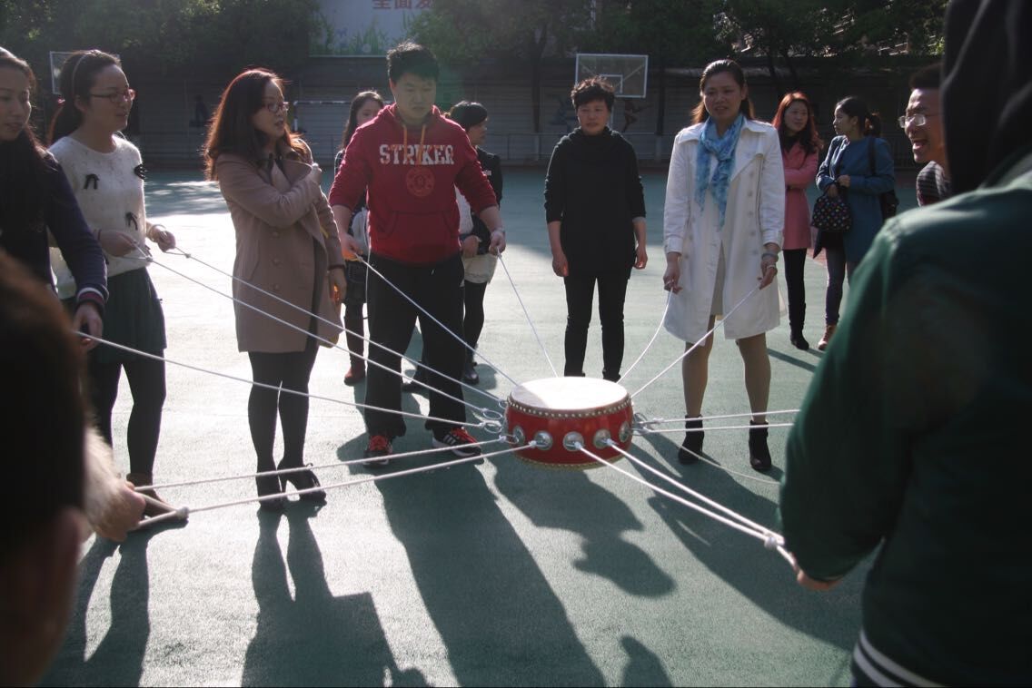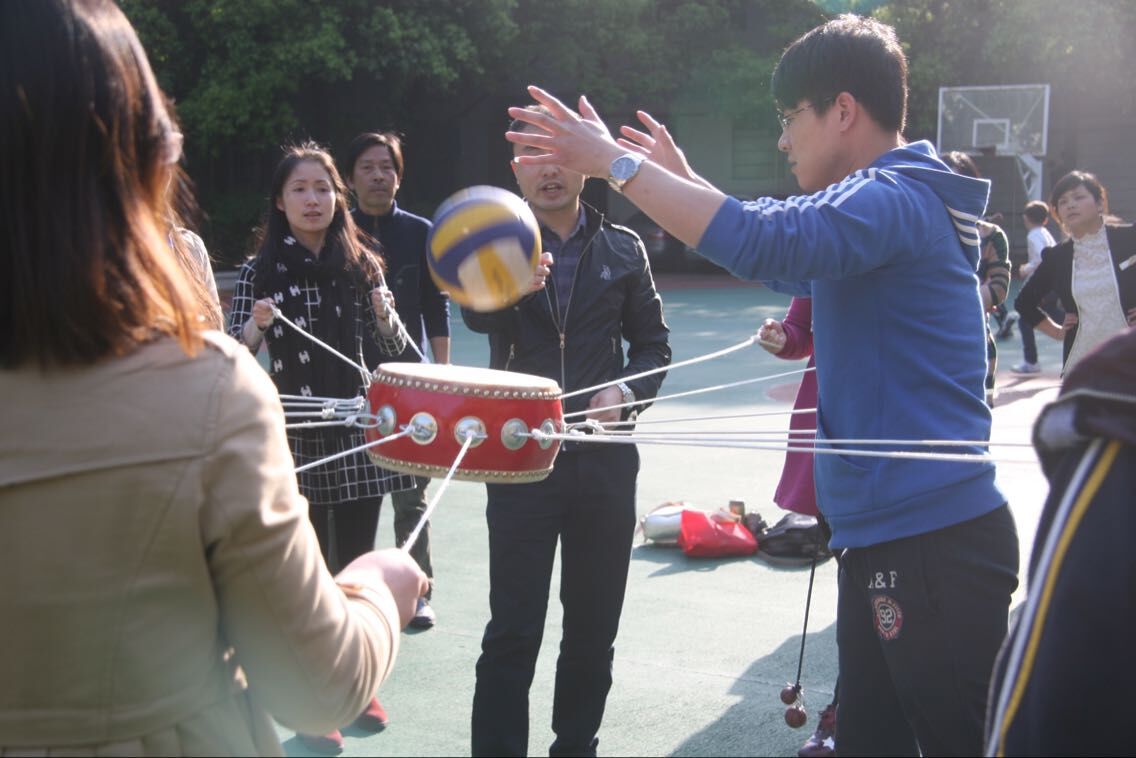 本次活动叫击鼓颠球,各队由12人组成,10人拉绳颠球,2人放球、捡球。90秒时间里放球和捡球的次数不限,球须在鼓面上弹跳5cm高度才算有效,放球的第一个不计入总个数。活动开始前,各队老师根据比赛规则商量策略。有的说:绳子一定要用力拉直,这样力度才均匀;有的说:绳子要拉松一点,方便走动;有的说:我们还是站在原地颠球,方便捡球放球的老师,能节约时间;还有的说:我们还是得一边走一边颠,这样能颠得更多。大家各抒己见,激动不已。