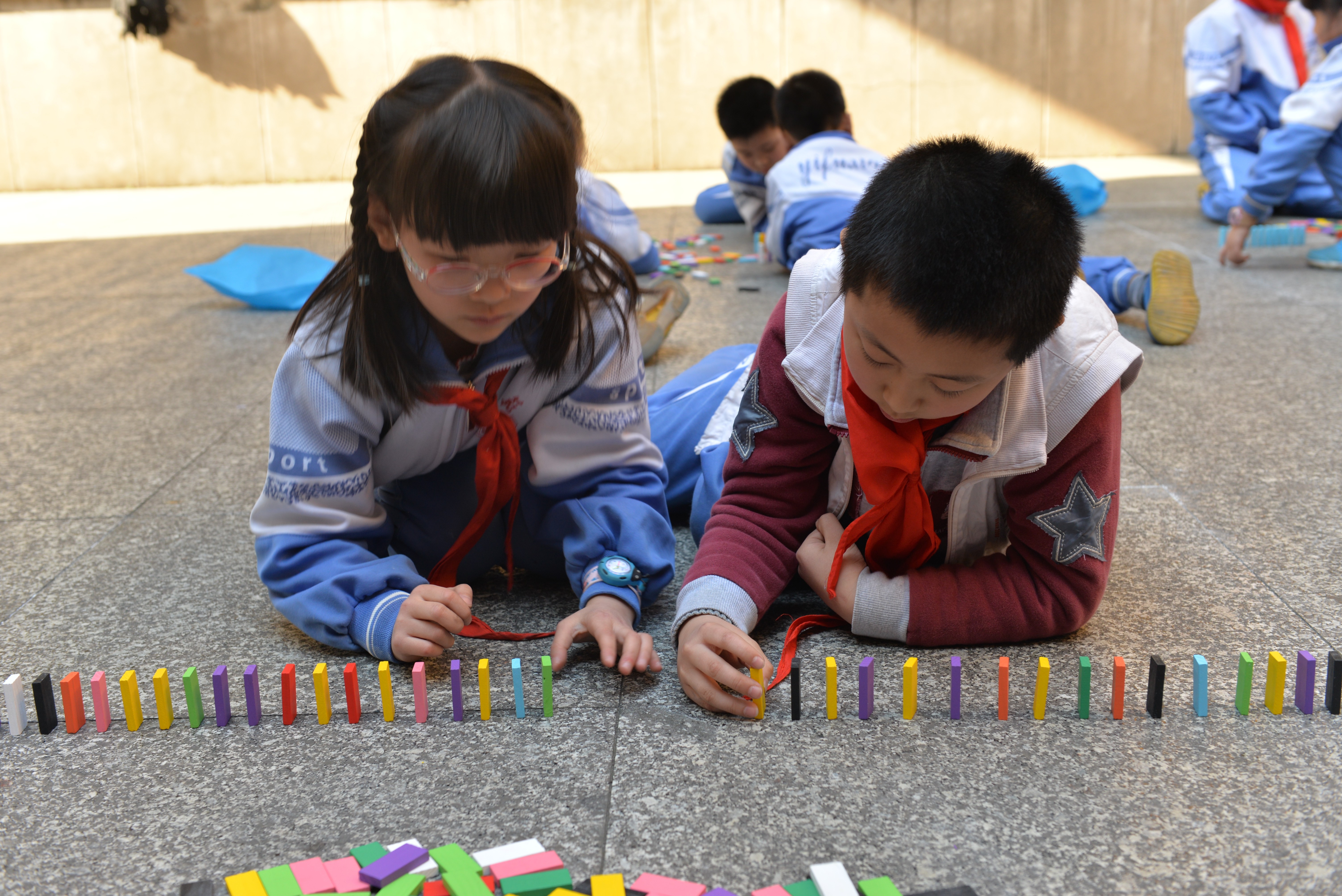 骨牌一张张摆下去,不仅考验了孩子们的体力、耐力和意志力,更培养了孩子们的智力、想象力和创造力。码牌时,骨牌因意外一次次倒下,孩子们有沮丧、有失落,时刻面临和经受着失败的打击。但孩子们也同样做到了遇到挫折不气馁,不退缩,一次次树立信心,鼓起勇气,重新再来。