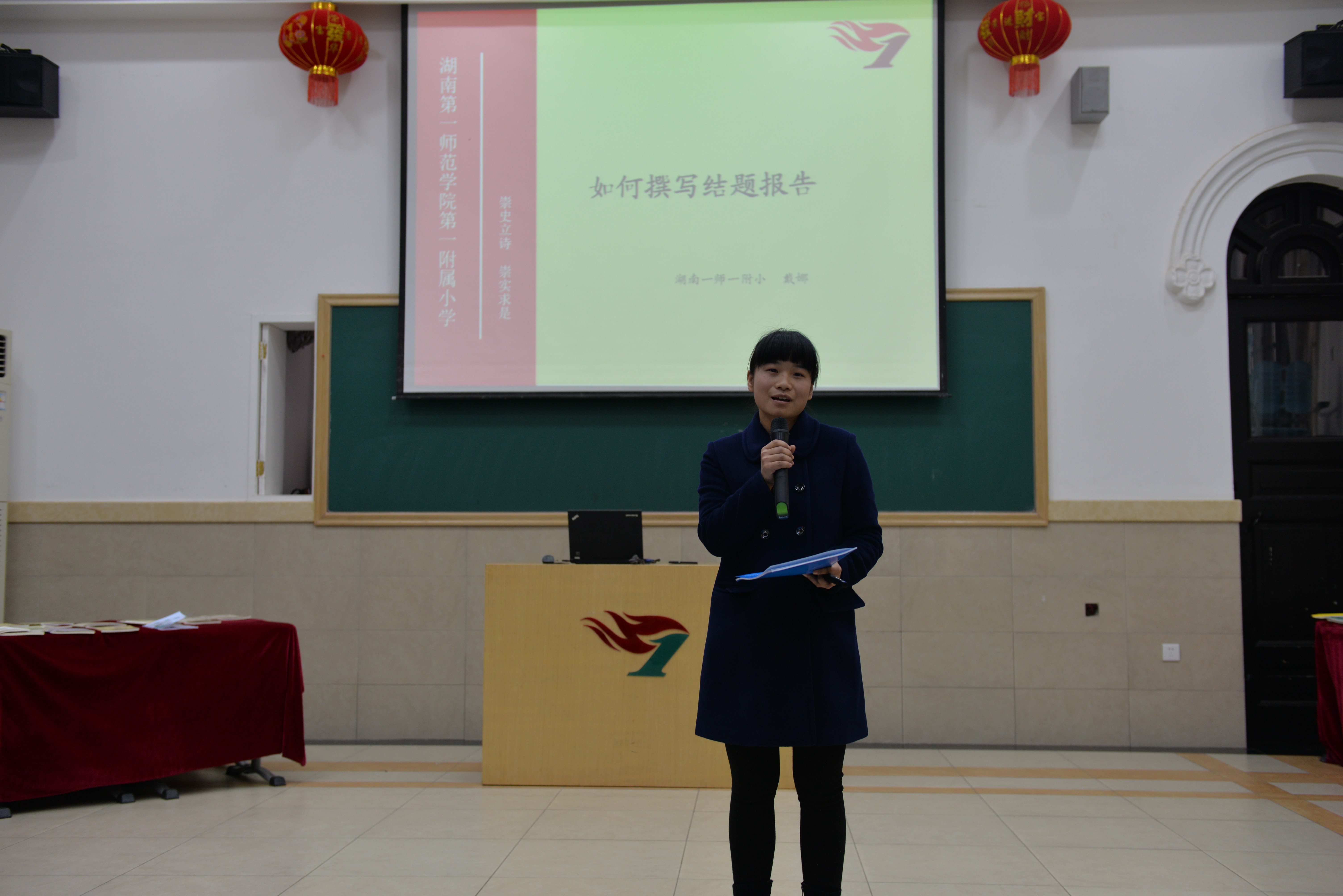 此次活动分为三个部分,首先是一附小江波兰副校长简单介绍我校课题工作开展的情况;接着由一附小董玲老师、喻萍老师、谢平老师、戴娜老师分别从“如何选题”、“如何整理和收集资料”、“如何开发校本教材”、“如何撰写结题报告”几个方面,结合自己的课题研究以“课题案例”的方式与老师们一起分享研究过程中的经验、感受、困惑与成长。四位老师精彩发言和所体现出来的课题研究意识、教育科研能力都得到了与会教师的一致好评。讲座之后,湖南省中小学教师发展中心专家周赞梅老师进行了精彩的点评,高度评价一附小的课题研究工作能以一校之力做到如此实属了不起;同时,周老师也对本次的四个微讲座提出了高水准的优化意见,她说到,优化之后要将这几个精彩的讲座带到省培、国培中去,不断的推广附小课题工作的宝贵经验。最后,熊华辉书记以散文诗般的语言为此次活动画上了圆满的句号。