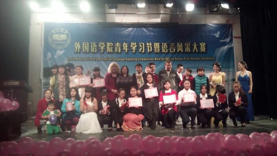 2014年11月11日,科技楼演播厅迎来了一场别开生面的外语晚会,语言风采大赛为外国语学院第十届青年学习节画上了一个圆满的句号。院党总支书记、分工会主席赵花云、副院长邓于祁、党总支副书记、分工会委员欧阳伶俐等领导老师受邀出席了本场晚会。我院教师姚芬芳、刘畅立、鞠清华、王曼以及外教Nate、Ruth等六位老师担任此次晚会的评委。本次语言风采晚会在沿袭传统的基础上,将英语舞台剧、英语演讲及英语歌曲进行得淋漓尽致的展现。13英语1班谢玮莹、美术设计学院13级642班宁珊珊两位选手沉着冷静、表现出色获得演讲专业组与非专业组第一名。13英语6班傅协以一首《Can’t take my eyes off you》征服在场所有观众夺得歌曲组冠军、13英语630班则以幽默风趣的《Prince's wedding》舞台剧获得本组第一名。