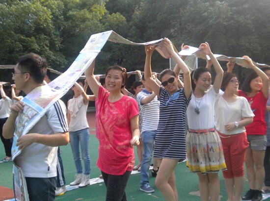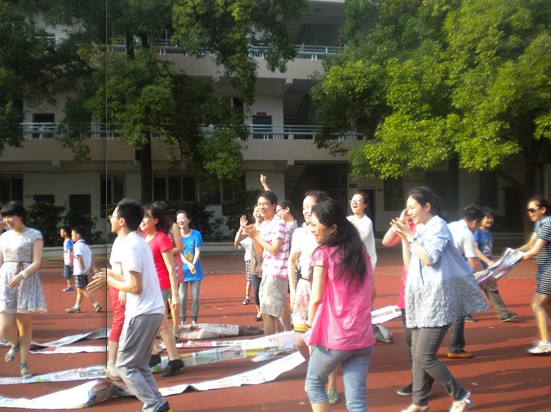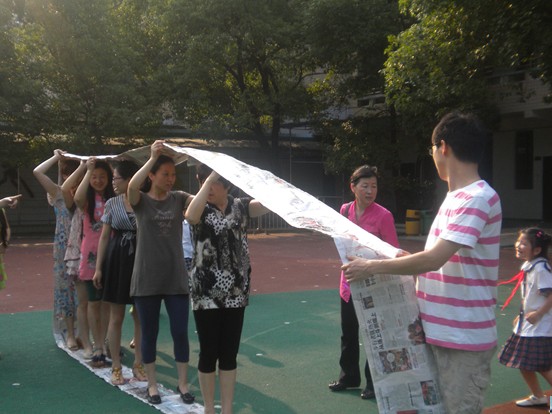 下午4:30,骄阳还没退下,学校操场上早已热火朝天,全体老师正在紧张激烈地准备着竞赛用的道具-----报纸“履带”,,折报纸,撕胶带,剪胶带,贴胶带,配合默契,团结分工在制作过程中凸显,很快四条长长的“履带”制作完成。老师们分成四支队伍,伴随一声哨响,由老师扮成的巨大“履带”在预订轨道上前行,他们整齐地,坚强地,快乐地驶向了终点。