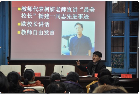 为了让更多的老师了解“最美校长”杨建一同志的先进事迹,我校于3月19日下午的教师会上,由出席报告会的我校教师代表、中学高级教师柯妍老师向全体附小教师宣讲了杨建一同志的先进事迹,大家对杨建一同志的那种为了教育事业无怨无悔,甚至牺牲自己生命的崇高精神油然而生敬意。随后欧校长向全体老师发出倡议,号召大家学习杨建一同志爱生如子、临危不惧、敢于担当的优秀品质,并以英国查尔斯王子的一句话——“世界上有许多不得不做的事情,这就是责任”与大家共勉。