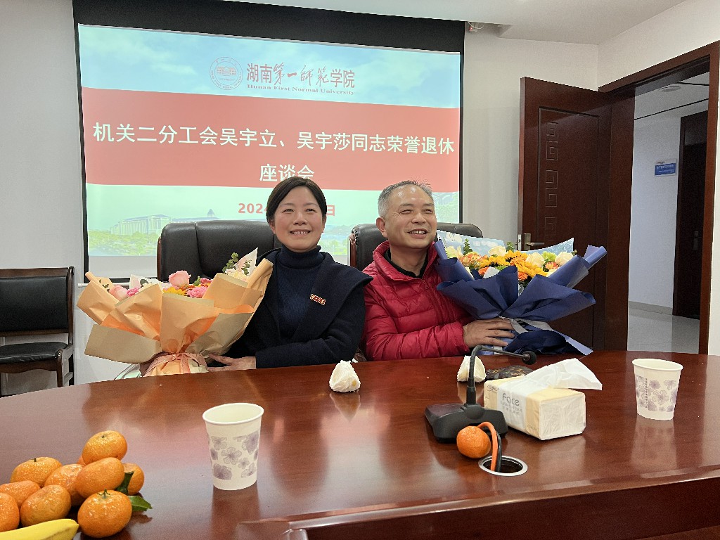 2024年1月12日下午,机关二分工会在百熙楼605室为2023年下半年光荣退休的吴宇立、吴宇莎同志举行了简朴温馨的荣誉退休座谈会,感谢他们长期以来为学校事业发展所做的努力和奉献,座谈会由机关二分工会委员邵纯主持,荣休教职工吴宇立、吴宇莎及其所在部门领导、工会委员、工会会员等40余人出席了本次茶话会活动。离退休处处长李亚林因事未能出席,但发来祝福视频。