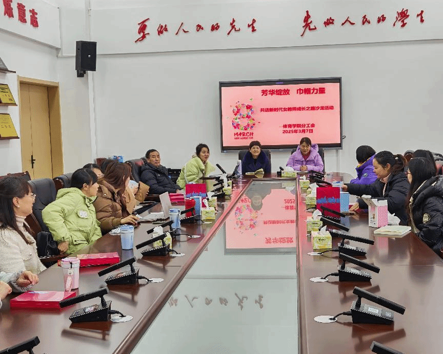 2025年3月7日,为庆祝第115个“三八”国际劳动妇女节,体育学院分工会在新体育馆会议室211举办“芳华绽放,巾帼力量”为主题的沙龙活动。院党委书记邹华秀,副书记朱建伟、副院长丁小芬,教学科研、管理服务一线的优秀女教师代表齐聚一堂,围绕“成长、奋斗、奉献”三大主题,共话新时代女性成长之路。