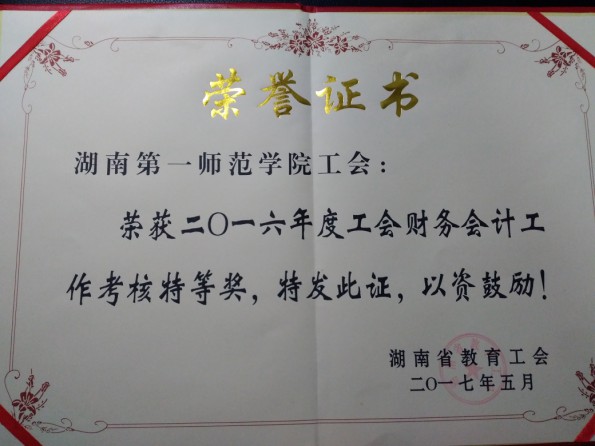 为了规范基层工会收支管理,提高基层工会财务管理水平,5月9—10日,湖南省教育工会对直属基层工会2016年度财务工作进行了考核检查。本次检查按经审审计的要求,采取检查和培训相结合方式,分两个阶段进行。第一天全天开展考核检查,第二天进行考核检查通报。评比出了特等奖、一等奖和二等奖。我校工会荣获湖南省教育工会财务会计工作考核特等奖,并荣获“2016年度财务工作先进单位”称号。这是我校工会财务工作首次获得此殊荣(陈晓琳)