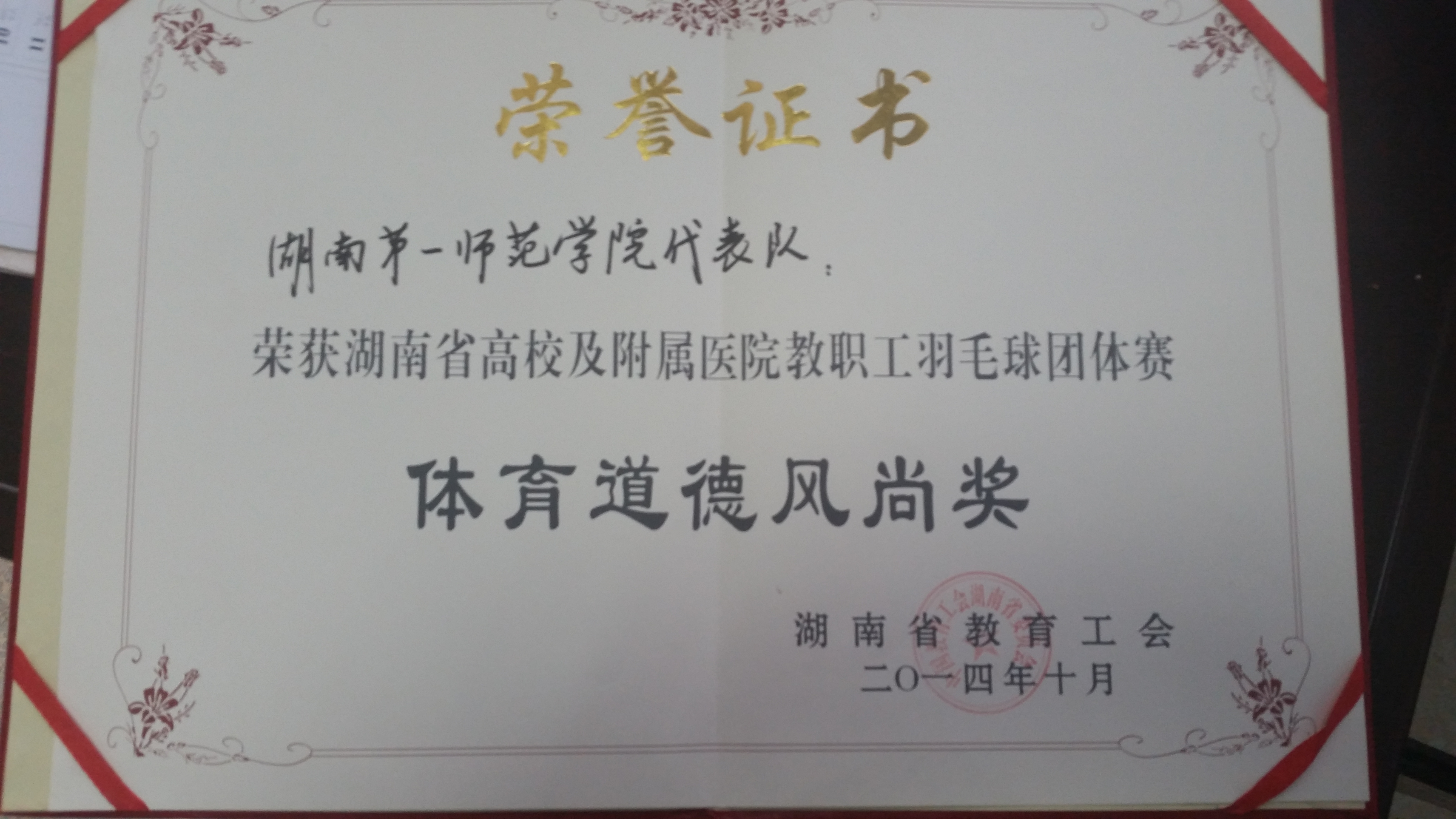 我校教职工羽毛球队在刚刚结束的“湖南省本科高校及附属医院教职工羽毛球团体赛”中获得“体育道德风尚奖”。