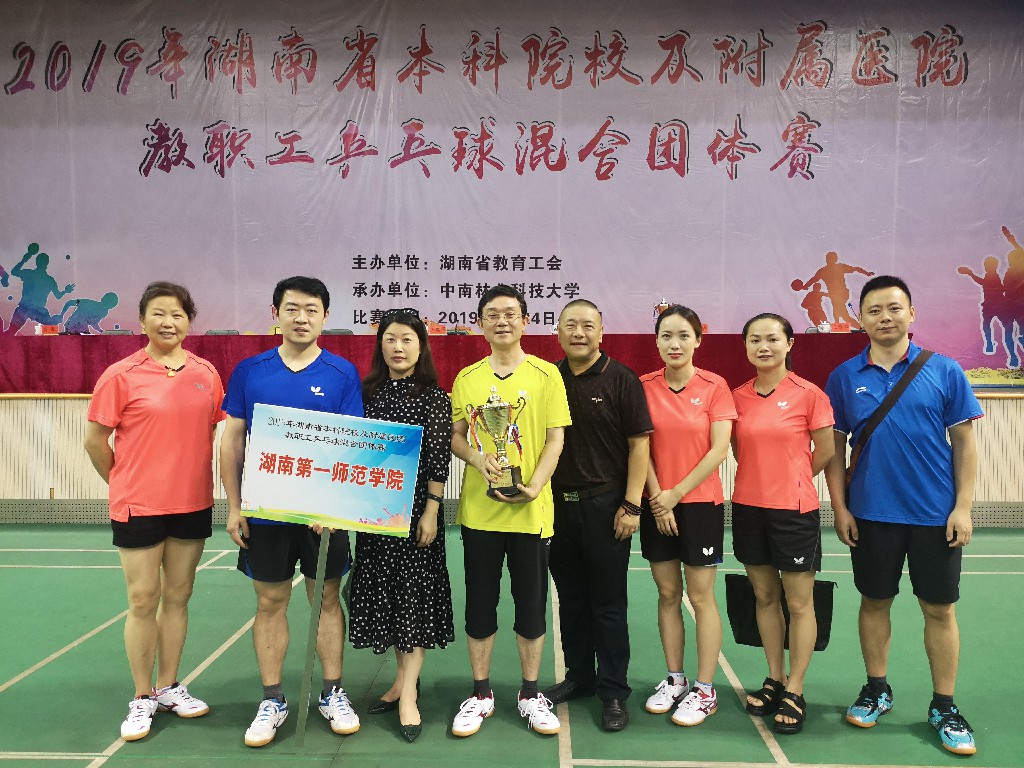 2019年湖南省本科院校及附属医院教职工乒乓球混合团体赛于2019年6月24日-26日在中南林业科技大学举行,我校乒乓球队取得了团体总分第八名的好成绩,为近年来我校参加该项赛事以来的最好成绩。