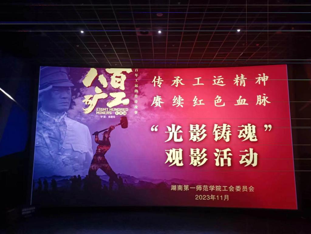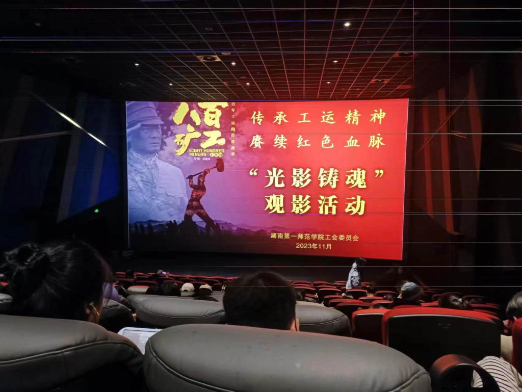 为深入学习贯彻党的二十大精神和习近平总书记在湖南考察时提出的“用好红色资源,讲好红色故事,搞好红色教育,让红色基因代代相传”的重要指示,按照湖南省总工会、中共湖南省委教育工委要求,校工会于2023年11月17日至24日连续四场组织全校700余名教职工和党员学生干部,在梅溪湖万达影城观看了由湖南省总工会、潇湘电影集团、中共衡阳市委宣传部联合摄制的电影《八百矿工上井冈》。