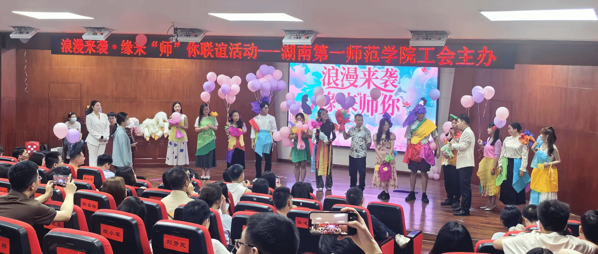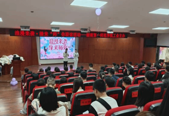 阳光明媚,微风轻拂。5月25日下午,校工会组织的“浪漫来袭·缘来‘师’你”教职工单身联谊活动在东方红校区特立楼南栋思政实训室圆满举行。活动邀请共青团长沙市直属机关工作委员会、长沙市公安局、雨花区教育局等单位的160余名单身职工参加。本次活动共有29对青年成功牵手,表达进一步交往的想法,收获了珍贵的友谊与难忘的回忆。 活动现场布置温馨浪漫,五彩斑斓的气球、绚丽的彩带与精心摆放的礼品相互映衬,营造出轻松愉悦的氛围。整个活动精心设计了破冰游戏、心动请摇骰、环保时装秀、自由交流等多个互动环节。